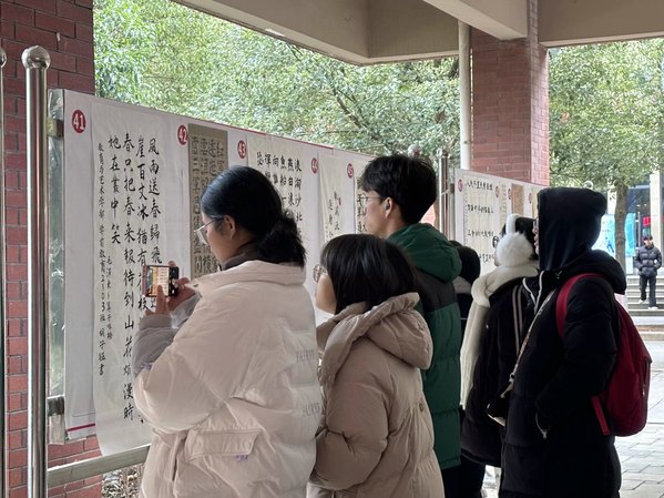 书法作品有硬笔、毛笔、粉笔三个类别,涵盖篆、隶、楷、行、草等多种书体,内容均取自毛泽东诗词,向人们展现毛诗纵横万里的境界,气吞山河、雷霆万钧的气势和高度乐观的革命精神。横平竖直皆风骨,撇飞捺扬是血脉,中国书法之美深深地感染着参观者。
