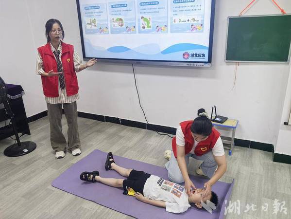 首先,在社区工作人员的安排下,志愿者们为孩子们开展了“暑期托管安全第一课”。课堂上,志愿者们通过图片演示和视频展播的形式,提醒孩子们要提高夏季防溺水的意识,让孩子们认识到溺水的危险性,同时邀请现场的小朋友进行情景模拟,开展防溺水应急演练,在志愿者的帮助、指导下,亲自尝试了发生溺水时应如何呼救,如何在专业救护人员到来之前做出最正确的胸部按压、人工呼吸、海姆立克急救法等简单急救措施。
