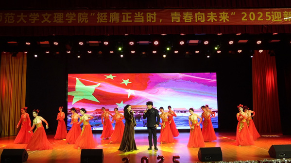 晚会节目形式多样,精彩纷呈。既有开场舞《奔跑的青春》瞬间点燃全场的活力,也有群舞《映山红》用优美舞姿演绎的红色深情;既有相声《返校》以妙语连珠带来的满堂欢笑,也有情景朗诵《怒放的青春》用慷慨激昂抒发的青年壮志。乐队一曲《海阔天空》唱响追梦的摇滚力量,走秀《溯光》则步态生辉,尽显礼仪风范。从深情款款的《落叶归根》《友情岁月》,到活力四射的舞蹈串烧,再到最终引爆全场的歌伴舞《我和我的祖国》,整场晚会高潮迭起,掌声不断。