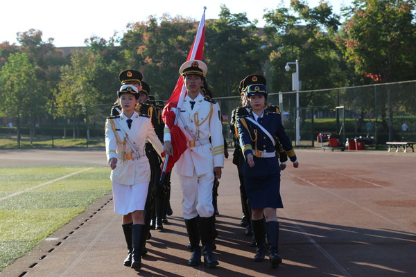 早上6时45分,升旗仪式开始。国旗护卫队步履铿锵,护送国旗到升旗台
