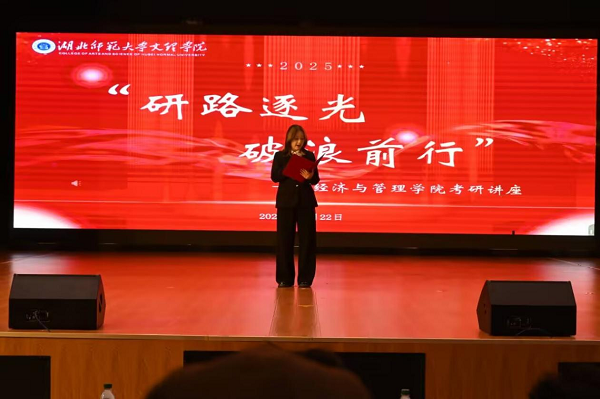 为帮助学子们熟悉考研规则、科学备考,10221830分,经济与管理学院在学术交流中心举办了“研路逐光,破浪前行”考研讲座活动。本次活动特邀湖北师范大学江喜林教授主讲,学院辅导员郑莎莎、田蓉蓉、刘成慈以及2023级全体同学参加