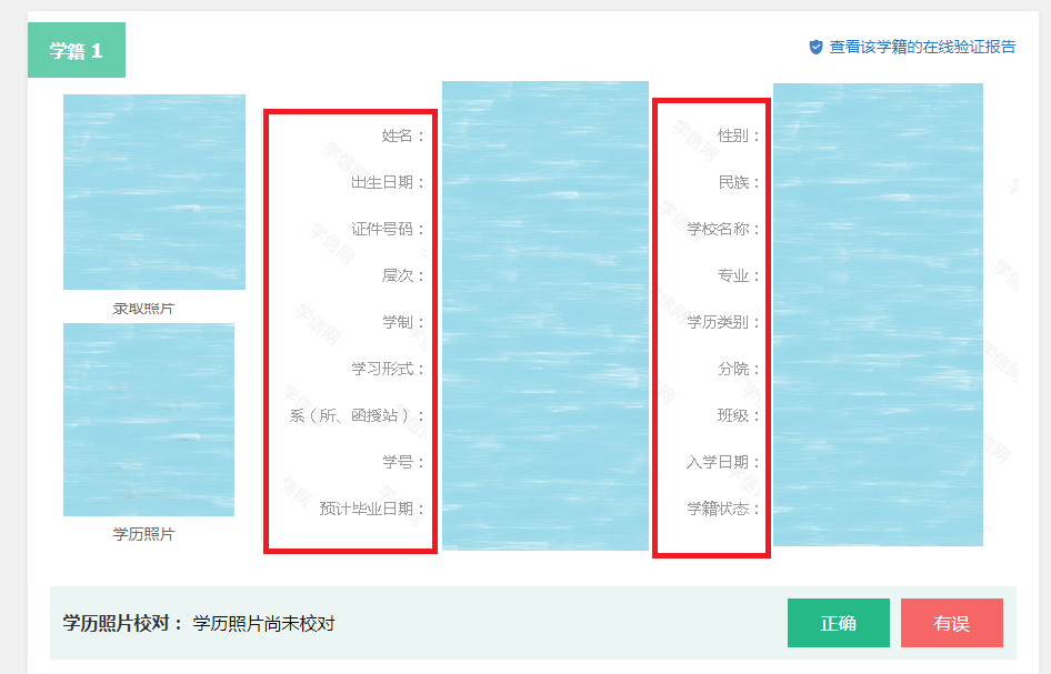 核对学籍信息,只需核对高等教育信息里的学籍信息,学历信息只有毕业以后才有!