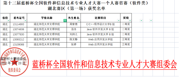 在校领导和学校各部门的支持和帮助下,理工学部顺利组织9名学生参加了第十三届蓝桥杯全国软件和信息技术专业人才大赛。赛前学部主任傅朝金教授和肖圣芳书记高度重视,委派李哲昊老师组织学生网报并参加为期两个月的赛前培训,张弛老师全程带队组织学生赴湖北师范大学参加比赛。此次比赛3名学生荣获二等奖,2名学生荣获三等奖。