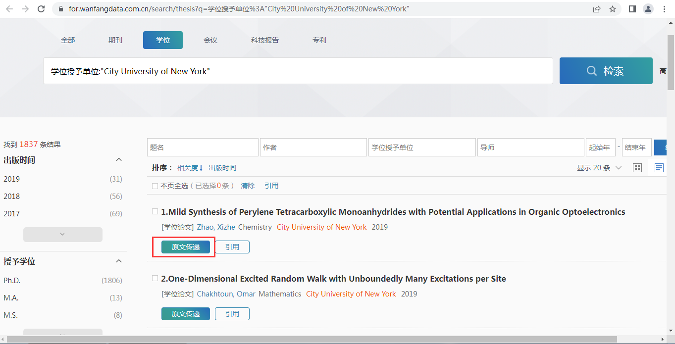 3.查询到所需文献后,单击题名可进入文献详情。如需下载全文,选择“原文传递”,输入邮箱地址,一个工作日内会发送到邮箱。