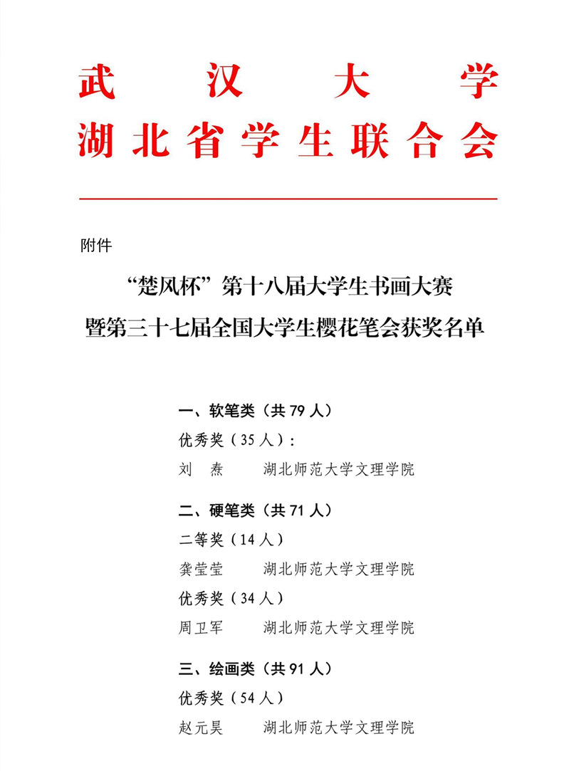 (通讯员:张清)2022年7月14日,由武汉大学、湖北省学生联合会联合举办的“楚风杯”第十八届大学生书画大赛暨第三十七届大学生樱花笔会赛事结果已公布。milan米兰官网_米兰(中国)刘焘、龚莹莹、周卫军、赵元昊四位同学荣获佳绩。