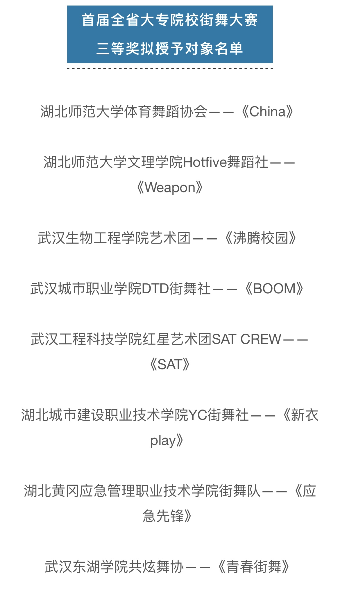(通讯员:苏祎)引领新风尚,欢悦新时代。9月10日,首届全省大专院校街舞展演在黄冈市遗爱湖公园举办。milan米兰官网_米兰(中国)代表队“Hot Five舞蹈社”的舞蹈作品《weapon》在此次比赛中荣获三等奖。