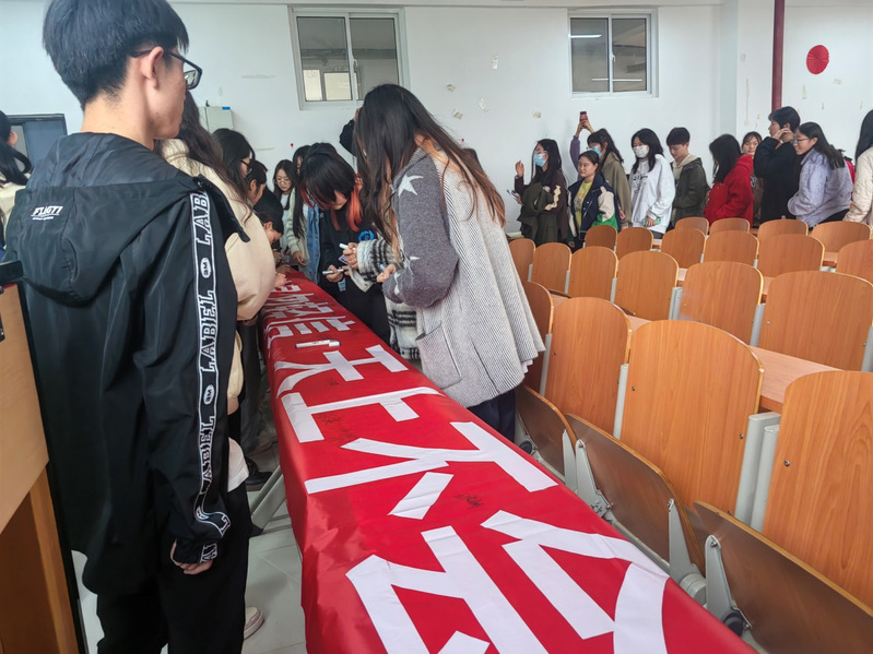 班会末尾,同学们宣读了反诈口号:“咬定真相不放松,谨防掉进诈骗中。不贪便宜不盲从,天降馅饼敲警钟。全民参与防范中,诈骗份子全剧终。”并纷纷在“涉钱信息勿轻信,天上不会掉馅饼”的横幅上签名,表明了他们在今后的学习生活中做到“不刷单、不裸聊、不在小平台交易、不接陌生电话、不点击未知链接”的决心。