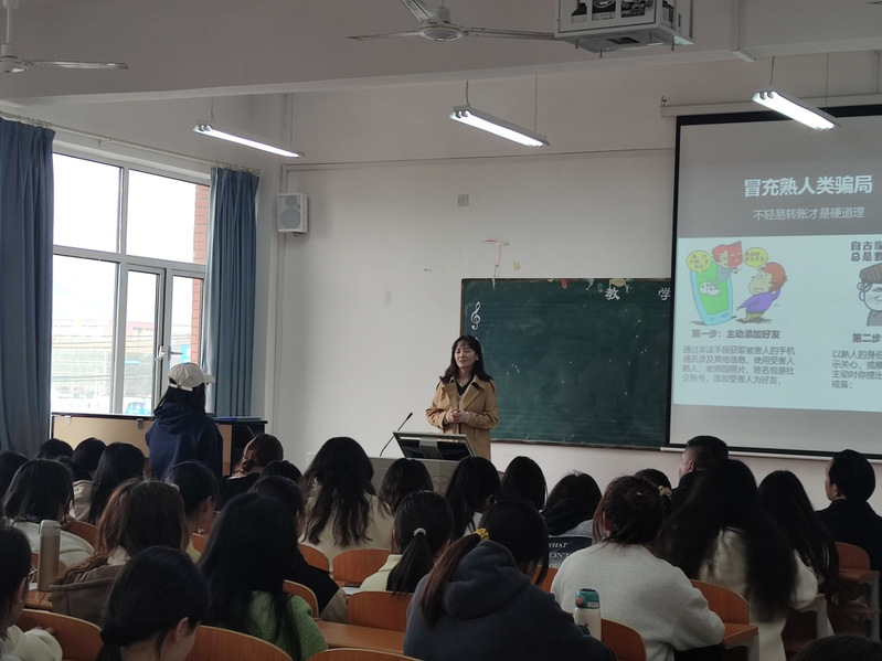 程林老师通过学生拍摄的“常见的学生被诈骗案例”视频引入班会主题,并结合校园发生的真实案例,从大学生被诈骗的原因、防诈骗班会的目的、防诈骗班会的意义以及常见的诈骗类型四个方面,深入浅出地讲解了防范电信网络诈骗知识,通过案例与防范方法相结合的方式,详细分析了校园中多发的诈骗类型,让反诈知识深入人心。