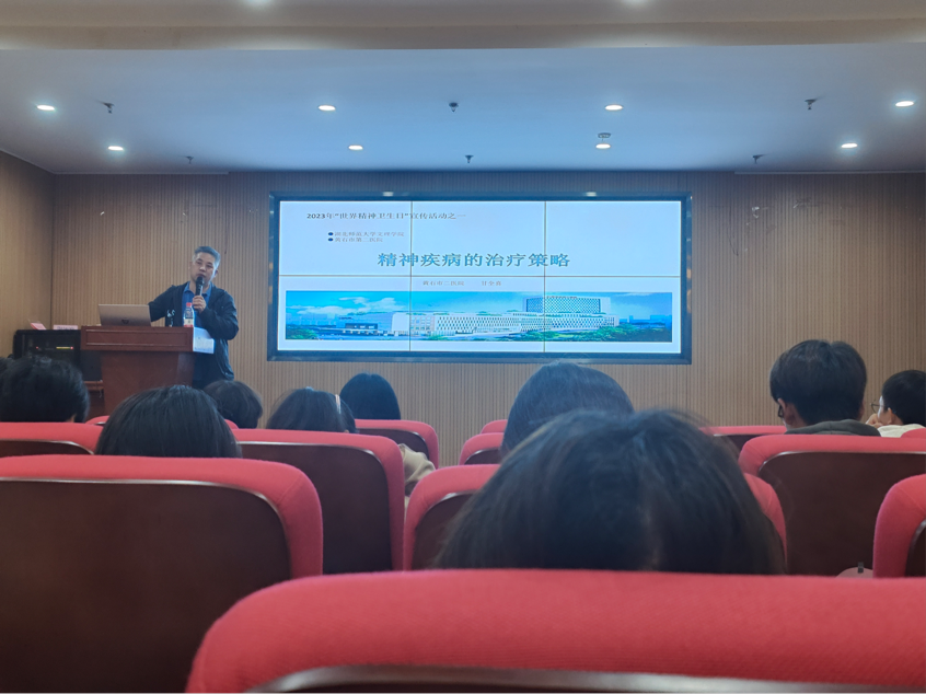 为助力本次心理健康月的正式开展,晚上19:00,milan米兰官网_米兰(中国)心理中心邀请到黄石二医院精神心理科主任甘全喜医生主讲“精神疾病的治疗”。甘医生首先介绍了精神疾病的总体分类、病因、特点、诊断、简史和治疗。指出精神疾病不同于其他疾病,其精神疾病器质性症状到后期才会显现。随后甘医生对妄想、抑郁症、躁狂症、双向情感障碍、人格障碍及性心理障碍等病症进行了详细介绍。讲座的最后,甘医生其独到的见解为在场的同学答疑解惑,赢得了一致好评。随着讲座的谢幕,本次心理健康月启动仪式正式谢幕。