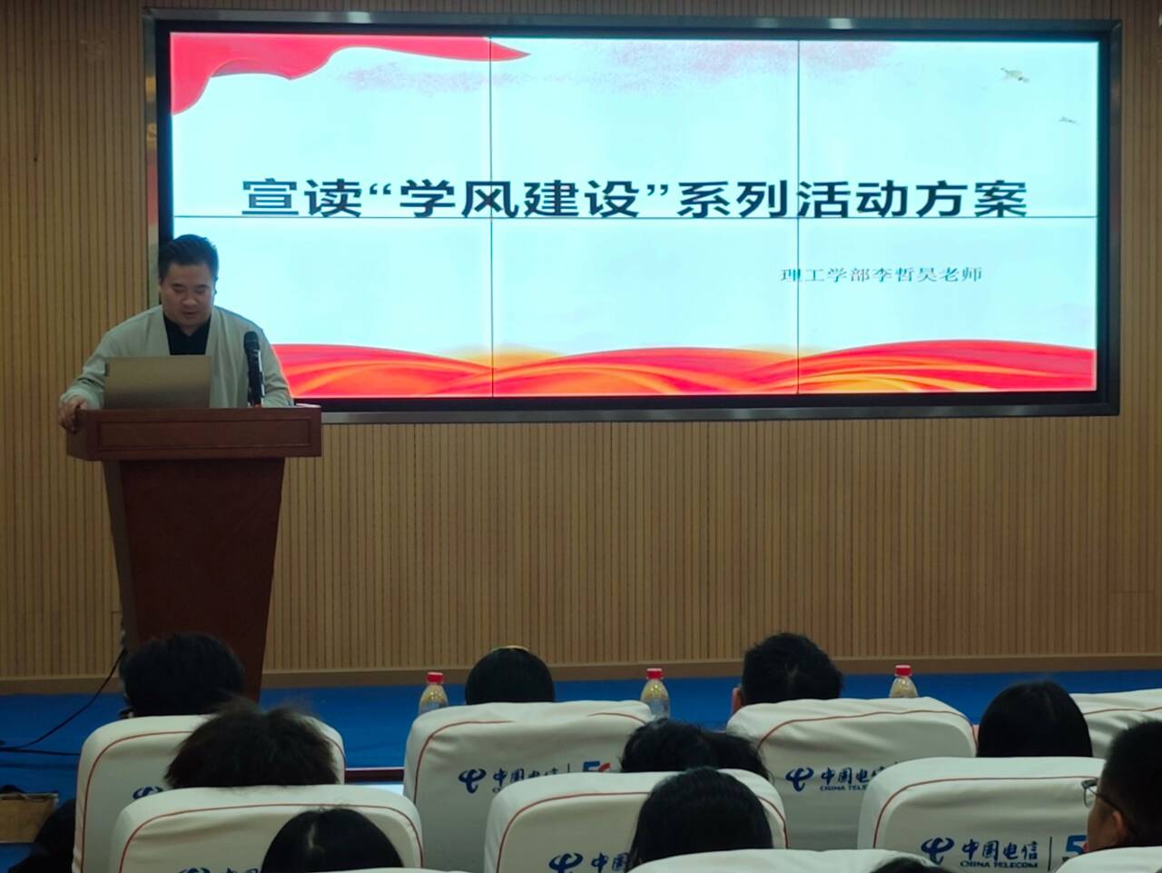 首先,肖圣芳书记发表了致辞,向同学们阐述了加强学风建设以及增强安全防范意识的意义并对班委们提出了殷切期望。他希望各班班委能够提高思想认识与政治站位,加强班级团结,做好班级领头羊、做好老师与学生的纽带、做好老师的小助手。紧接着,李哲昊老师介绍了“学风建设月”系列活动方案,学部策划了讲座、竞赛等8项活动,这些活动形式丰富多样、具有很强的针对性,并且尤为注重因材施教这一理念,照顾到了不同专业、不同年级学生对活动的需求。随后,理工学部学习部部长沈雪茹同学进行了倡议发言,她倡议全体理工学子要立志高远勇担使命、树立良好的学风和班风,以青春风采和实际行动推进学风建设。