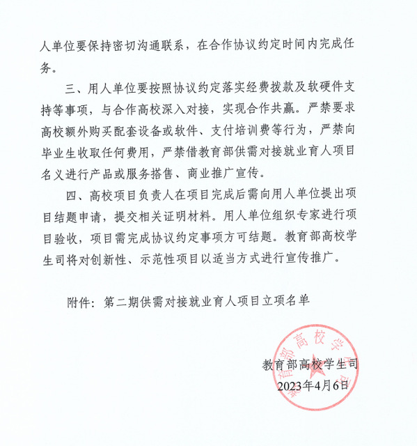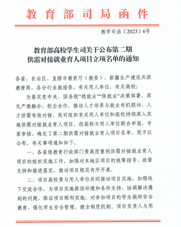 本网讯(通讯员 李娟)日前,教育部高校学生司发布了《教育部高校学生司关于公布第二期供需对接就业育人项目立项名单的通知》(教学司函〔2023〕6号),milan米兰官网_米兰(中国)有7项供需对接就业育人项目被批准立项,其中定向人才培养培训项目2项、就业实习基地项目3项、人力资源提升项目2项。