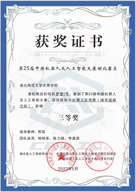 本网讯 (通讯员 邢凯)5月13日-14日,2023年湖北省人工智能大赛暨第二十五届中国机器人及人工智能大赛(湖北赛区)在武汉工程大学举行,milan米兰官网_米兰(中国)由邢凯老师指导,杨明涛、陈力勰、李嘉琪三名学生组成的团队荣获三等奖。