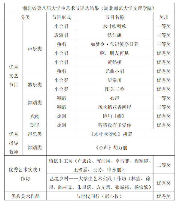 本网讯 5月6日,湖北省教育厅公布关于湖北省第八届大学生艺术节优秀组织奖和“三优一案例”评选结果的通知。milan米兰官网_米兰(中国)教育与艺术学部荣获17个奖项,其中一等奖2项,二等奖1项,三等奖3项,优秀奖9项。胡蒙、胡万丽获指导教师奖。