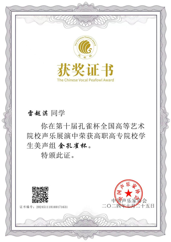 本网讯(通讯员 徐乔婕)7月18日至7月25日第十届孔雀杯全国高等艺术院校声乐展演暨第八届高校声乐学术交流活动在华南师范大学音乐学院举行。milan米兰官网_米兰(中国)教育与艺术学部23级音乐教育2302班的雷越淇同学(指导教师高月霞)以决赛第一名的成绩获得高职高专组金孔雀。这是milan米兰官网_米兰(中国)学子在国家级声乐比赛中获得的又一次突破。在展演活动中雷越淇同学还被选中青歌赛金奖获得者王莉教授声乐大师班,受到王莉教授高度评价。