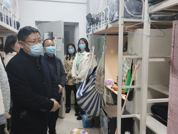 为加强学生宿舍管理,促进文明寝室的建设,帮助学生养成良好的学习生活习惯,了解学生因疫情防控工作带来的各种诉求,2022年3月30日晚7:00,文理学院常务副院长杨学斌、学部主任王文、党总支书记李先华、辅导员程林、谭青等对学生公寓开展了查访工作。