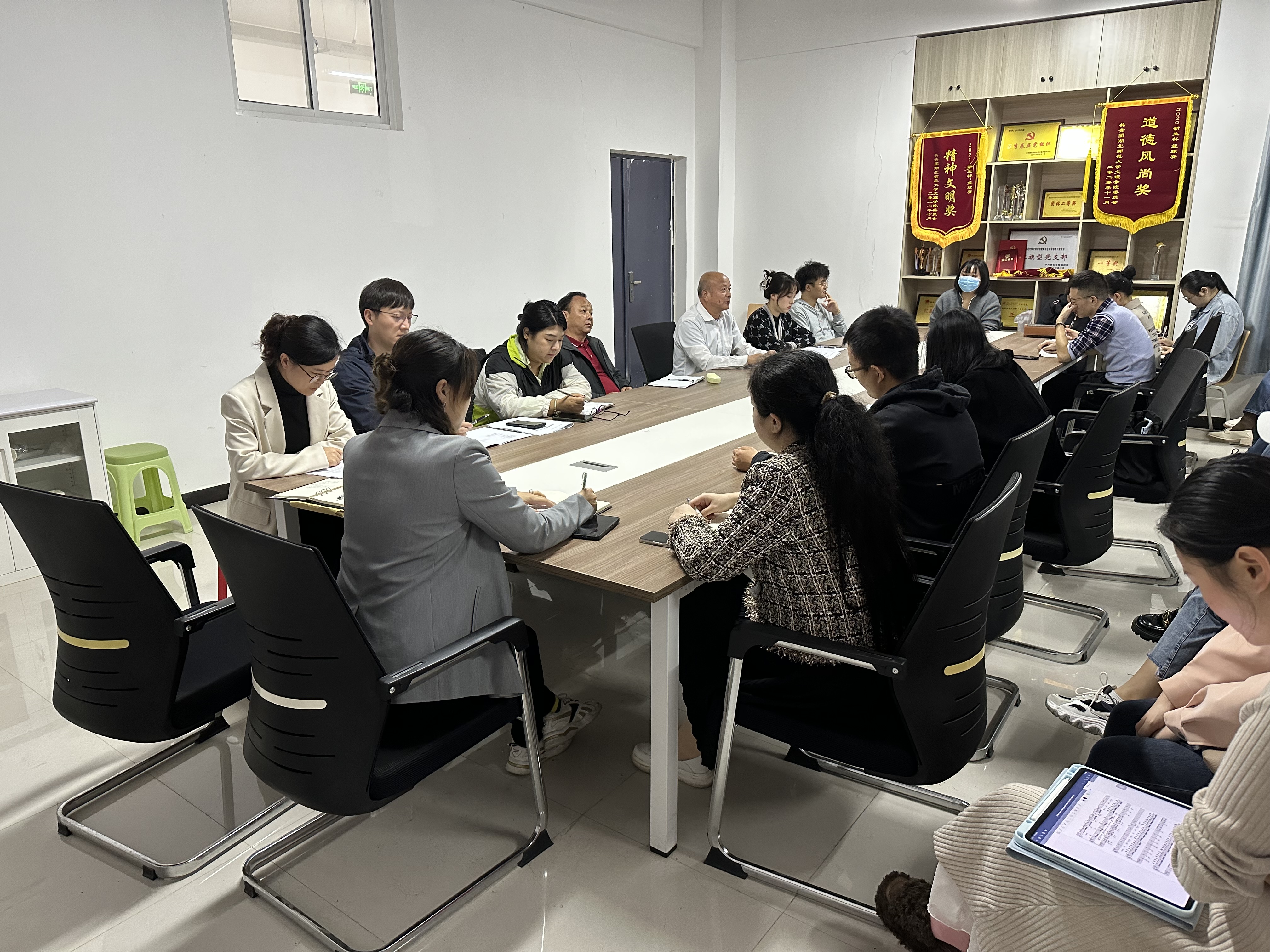 2023年11月9日中午12:00,教育与艺术学部在1号实验楼414会议室召开了全体教职工期中工作会议,参加此次会议的有学部主任王文、学部党总支书记李先华及教育与艺术学部全体教职工,本次会议主要包括以下几个议程:1.开展全体教职工政治理论学习,教工党支部书记汤澜和学生党支部书记尹誉霖领学;2.李先华书记补充强调党建工作和学生安全等相关工作;3.王文主任对期中教学检查事宜进行总结,并强调毕业论文、教师集体活动和教科研项目等工作的重要性;4.各教研室开展教研活动。