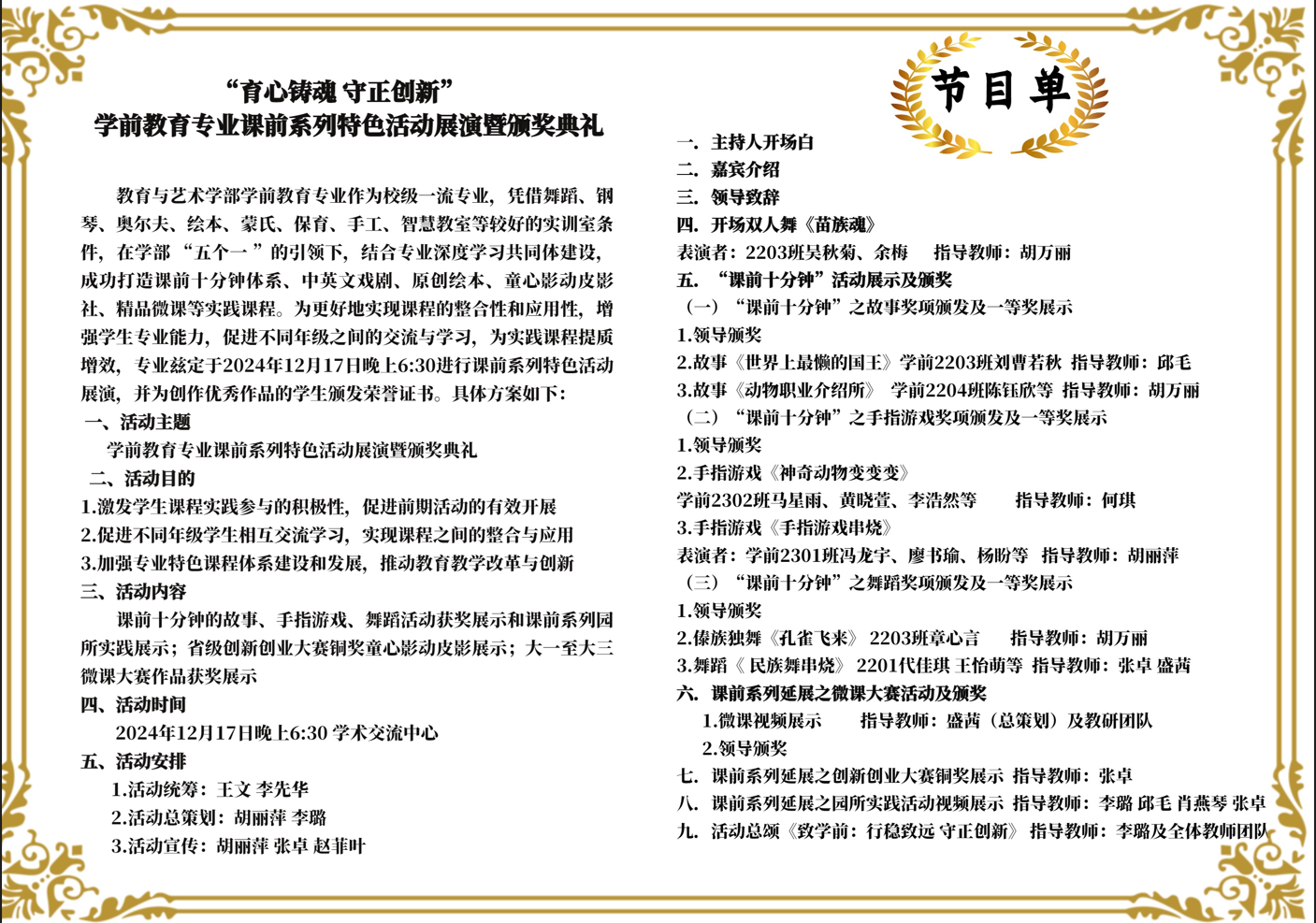 为加强学前教育专业在课程建设、实践教学、技能训练、协同培养方面的建设,确保“五个一”工程的落实。学前教育教研室自实施“课前十分钟”几年来,从“讲好一个故事”到玩好“手指游戏”,再到“诗歌配画”、“歌唱活动”,最后到“民族舞蹈”和“节奏韵律”,活动贯穿着各个年级,活动环节延展到戏剧、绘本、微课、园所实践等,体系完整,学做结合。2024年12月17日晚6:30,学前教育专业在学术报告厅面向全校师生进行课前系列活动展演和颁奖典礼。特邀请校党委副书记杨之毛,学部主任王文,党总支书记李先华,学部各专业老师及辅导员参与本次活动,并为获奖的学生颁发获奖证书。活动安排井然有序,节目环节紧凑,内容丰富多彩,赢得了现场观众一致的好评,同时活动过程由milan米兰官网_米兰(中国)招生办抖音账号和微信公众号进行同步直播。